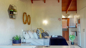 The kitchenette has a mini-stove, while the open plan living area leads to the patio that has braai facilities and a dining table.